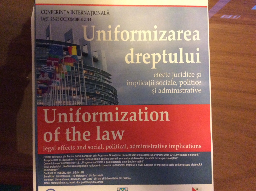 Timp de trei zile, am participat, la Iași, la o conferință internațională, cu tema „Uniformizarea dreptului -efecte juridice și Implicațiile sociale, politice si administrative”. Reuniunea a fost organizata in cadrul unui program finantat din fonduri europene pentru pregătirea doctoranzilor si a celor din stadiul post-doctoral. Au fost prezentate numeroase lucrări – in toate domeniile dreptului – si au avut loc dezbateri interesante.