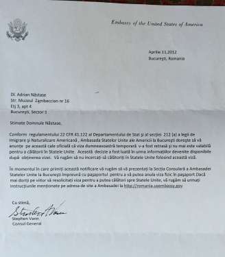 „Fostul premier Adrian Năstase s-a declarat, joi, ‘mirat’ de motivul pentru care i-a fost retrasă viza de intrare în SUA, în aprilie 2012, precizând că, după condamnarea pe fond ‘în legătură cu pixurile din campania electorală’ şi înainte ca respectiva condamnare să devină definitivă, a primit o scrisoare de la consulul american.
