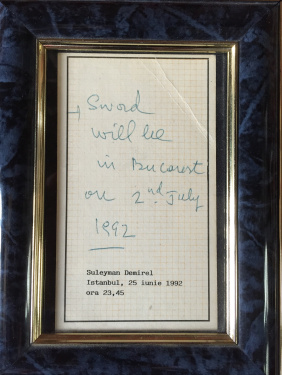 Imi amintesc, spre exemplu, de discutia noastră – de la Istanbul, cred – când, in conditiile in care Parlamentul turc nu a fost de acord să facem un schimb de obiecte de patrimoniu, pentru a lua inapoi sabia (spada) lui Stefan cel Mare, premierul de atunci al Turciei – Demirel – mi-a promis (eram ministru de externe) că pentru a onora canonizarea lui Stefan cel Mare, din 1992, Turcia ne va…