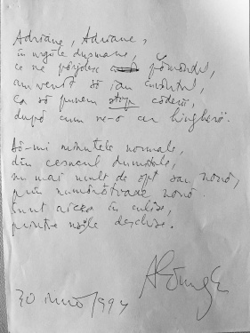 La Cornu, am gasit, intre hartiile mele, un „bilet”, scris „pe picior”, pe care mi l-a trimis Adrian Paunescu, in 30 iunie 1994, atunci cand, in calitate de senator de Dolj, insista sa ia cuvantul intr-o sedinta a Parlamentului, sedinta pe care o conduceam. Imi amintesc faptul ca timpii de interventie ai grupului sau parlamentar se epuizasera si, de aici, solicitarea insolita: