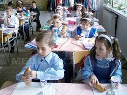 In primii ani, copiii prescolari si scolari primeau un corn simplu (80 gr.) sau biscuiti (44 gr./pachet) si lapte pasteurizat sau UHT (200 ml.) sau iaurt sau lapte batut (140 gr), in mod alternativ.